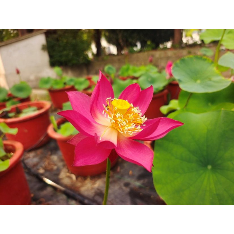 Le Nelumbo 'New Chuchu' est un petit lotus exceptionnellement coloré, offrant des fleurs simples d'un rose fuchsia éclatant sur un cœur jaune solaire, parfait pour les cultures en mini-bassins.