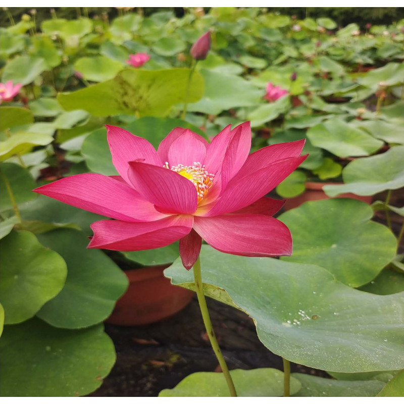 Le Nelumbo 'Crimson Goblet' est un lotus miniature aux fleurs simples d'un rouge cramoisi profond, parfait pour ajouter une note de passion et d'élégance aux plus petits jardins d'eau.