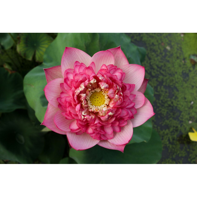 Le Nelumbo 'Roosters and Morning Bells' est un lotus de taille intermédiaire aux fleurs doubles rose pourpré, célèbre pour sa floraison très précoce et sa structure florale unique.