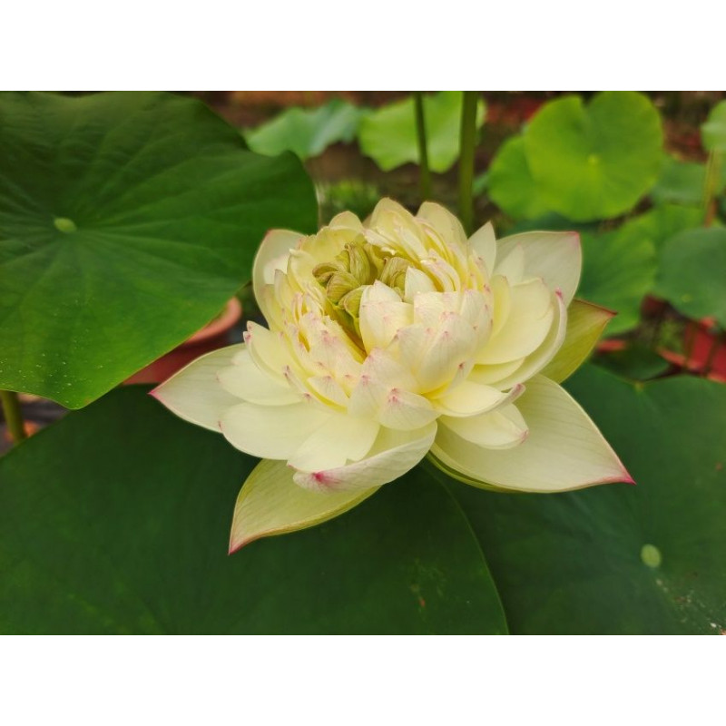 Le Nelumbo 'Chinese Beauty Dian' est un grand lotus majestueux aux fleurs doubles blanc crème finement bordées de rose, il nécessite de grands contenants pour exprimer toute sa beauté.