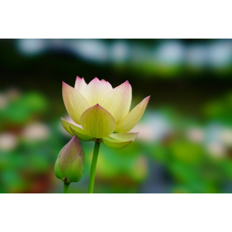Le Nelumbo 'Round Petal Brocade' est un grand lotus lumineux aux pétales larges et arrondis, offrant un dégradé élégant allant du jaune soufre à la base jusqu'au rose pourpré aux extrémités.