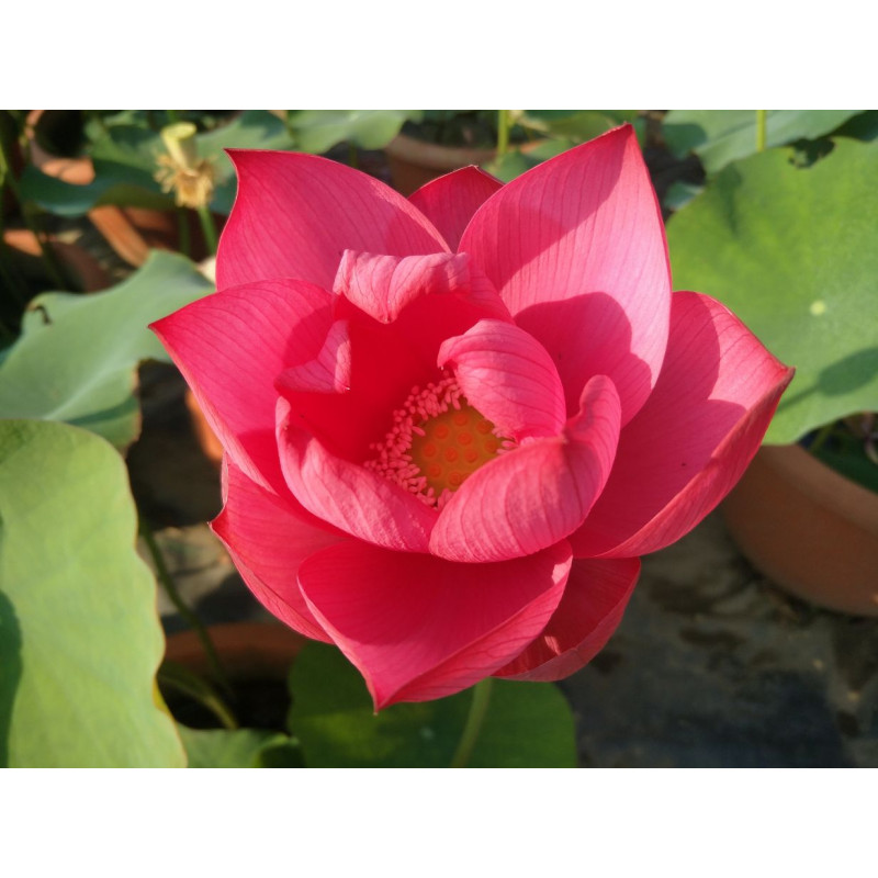 Le Nelumbo 'Little General' est un lotus de taille moyenne au tempérament affirmé, offrant des fleurs semi-doubles d'un rose magenta intense et une silhouette d'une grande robustesse.