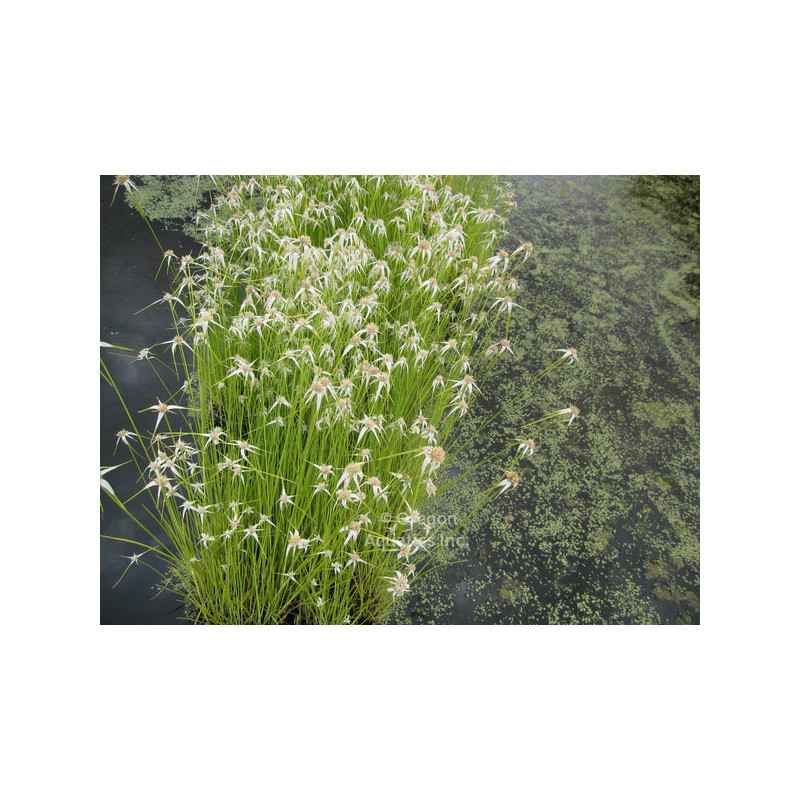 La Dichromena colorata (Étoile blanche) est une plante de berge unique, célèbre pour ses bractées d'un blanc éclatant disposées en étoile, offrant un contraste saisissant avec son feuillage vert durant tout l'été.