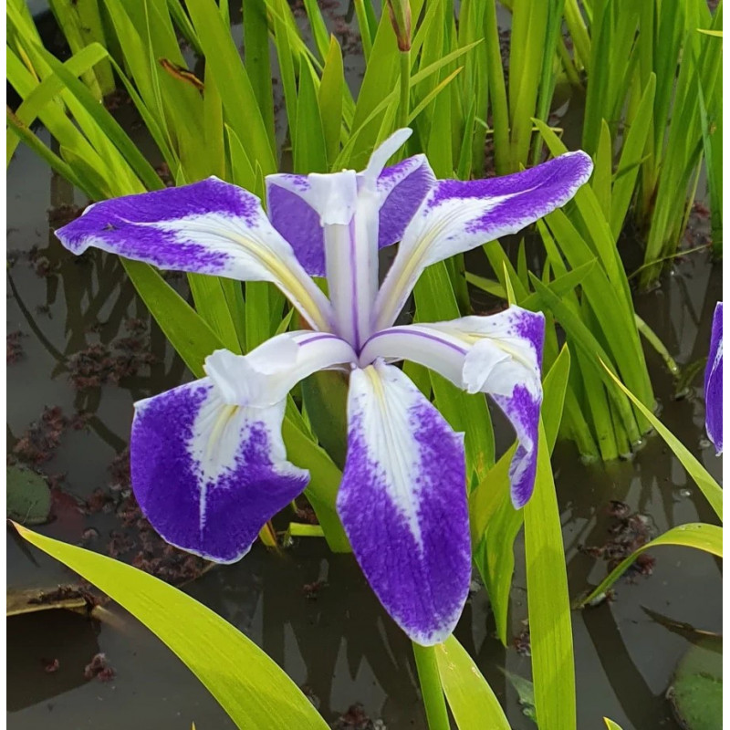 L'Iris 'Mottled Beauty' est une variété aquatique remarquable par ses fleurs blanches finement tachetées de bleu azur, idéale pour fleurir durablement les zones peu profondes du bassin.
